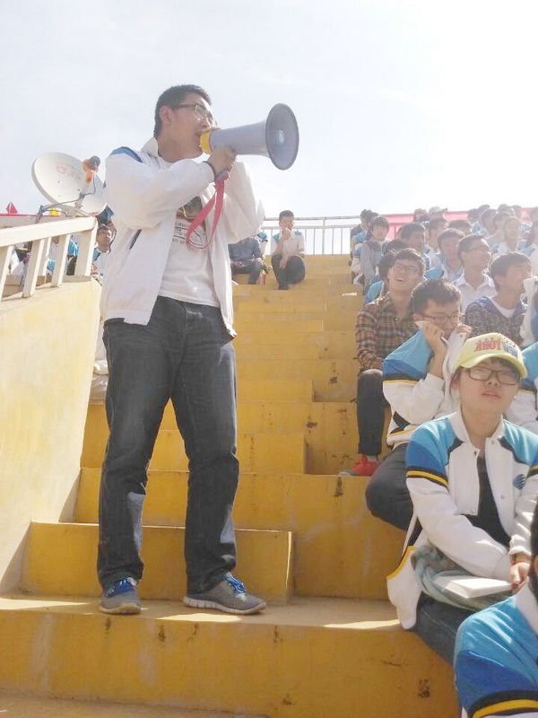 同學(xué)們頂著驕陽,穿著校服有序地坐在看臺上,眼睛齊刷刷地盯著同一個目標(biāo)——導(dǎo)員。他面向大家,發(fā)出鏗鏘有力的聲音:“比賽即將開始,你們要注意代表咱們學(xué)院的運動員,等他們沖刺過來時,大家一定要為他們吶喊助威。我知道今天炎熱依舊,但為了向那些在烈日下仍然拼搏的同學(xué)們,我們要做他們的堅強后盾,要讓他們感受到我們的熱情和真誠,大家一定要堅持下去!”發(fā)話完畢,導(dǎo)員一個轉(zhuǎn)身,無視毒辣的日光照射,屹立在看臺上,時而用嚴(yán)肅面孔、沉默不語之態(tài)維護(hù)現(xiàn)場的秩序,時而指揮同學(xué)們,一鼓作氣地加油助威。