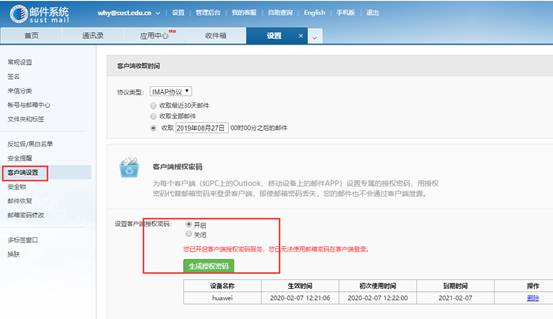 如果有用戶使用電腦或者手機(jī)app的客戶端收取郵件,可以打開【客戶端授權(quán)】的功能,打開方法如圖5所示。用生成的授權(quán)碼代替郵箱密碼完成客戶端設(shè)置。