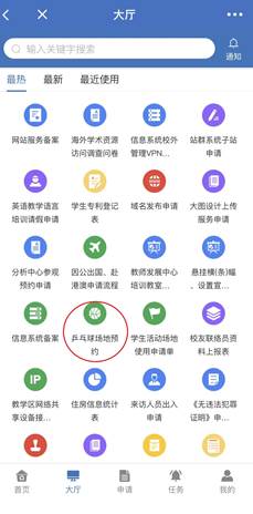 用戶(hù)首先登陸手機(jī)is科大客戶(hù)端,然后通過(guò)應(yīng)用服務(wù)中的“網(wǎng)上辦事大廳”→“乒乓球場(chǎng)地預(yù)約”進(jìn)入服務(wù):