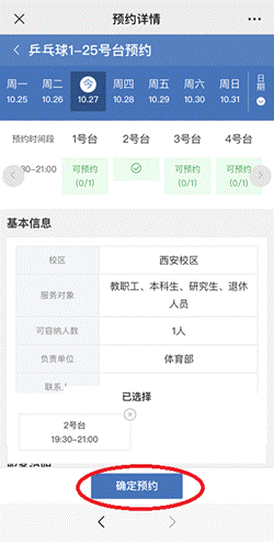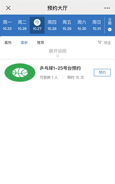 進(jìn)入乒乓球場(chǎng)地預(yù)約服務(wù)后,找到需要使用的場(chǎng)地,根據(jù)需要進(jìn)行預(yù)約即可。