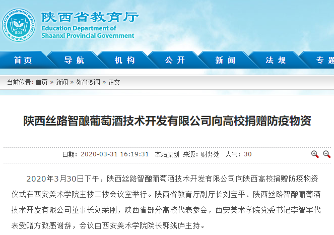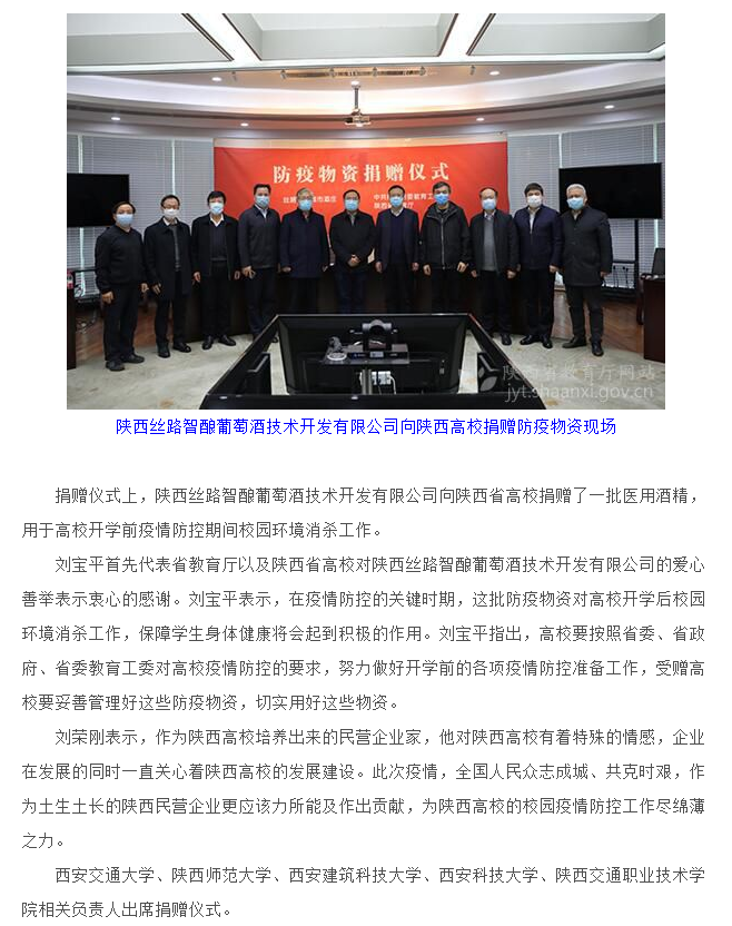 3月31日,陜西省教育廳官網(wǎng)報道了我校校友、陜西絲路智釀葡萄酒技術(shù)開發(fā)有限公司董事長劉榮剛向高校捐贈防疫物資,全文鏈接如下:http://jyt.shaanxi.gov.cn/jynews/jyyw/202003/31/100303.html