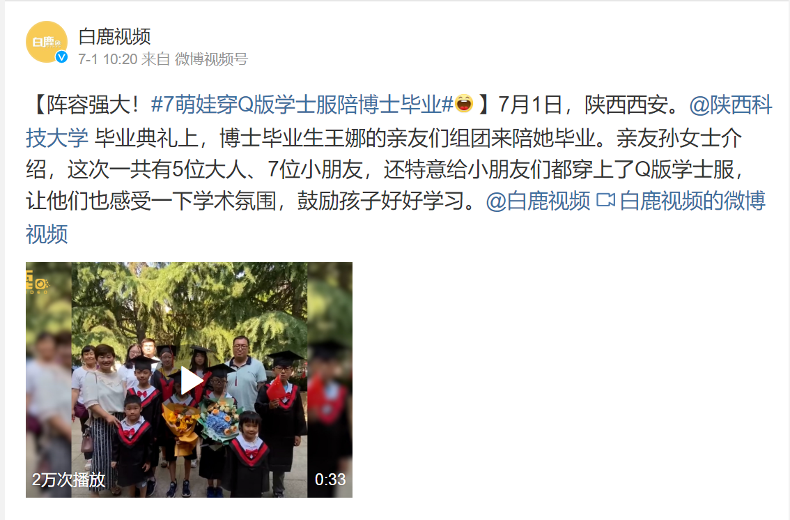 近日,白鹿視頻新浪微博賬號報道7萌娃穿Q版學(xué)士服陪我校博士畢業(yè)生王娜畢業(yè)。