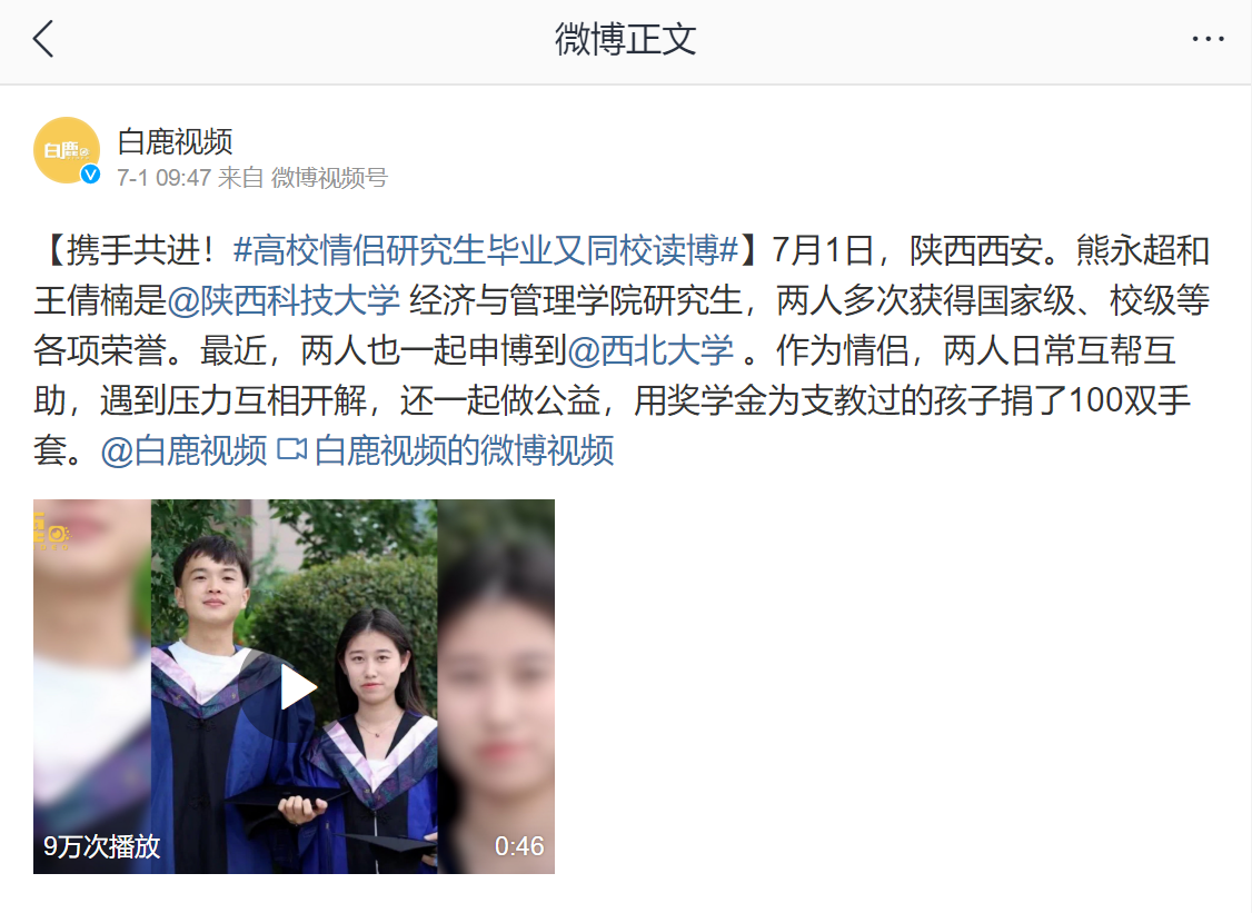 近日,白鹿視頻新浪微博賬號報道我校情侶研究生畢業(yè)又同赴西北大學(xué)讀博。