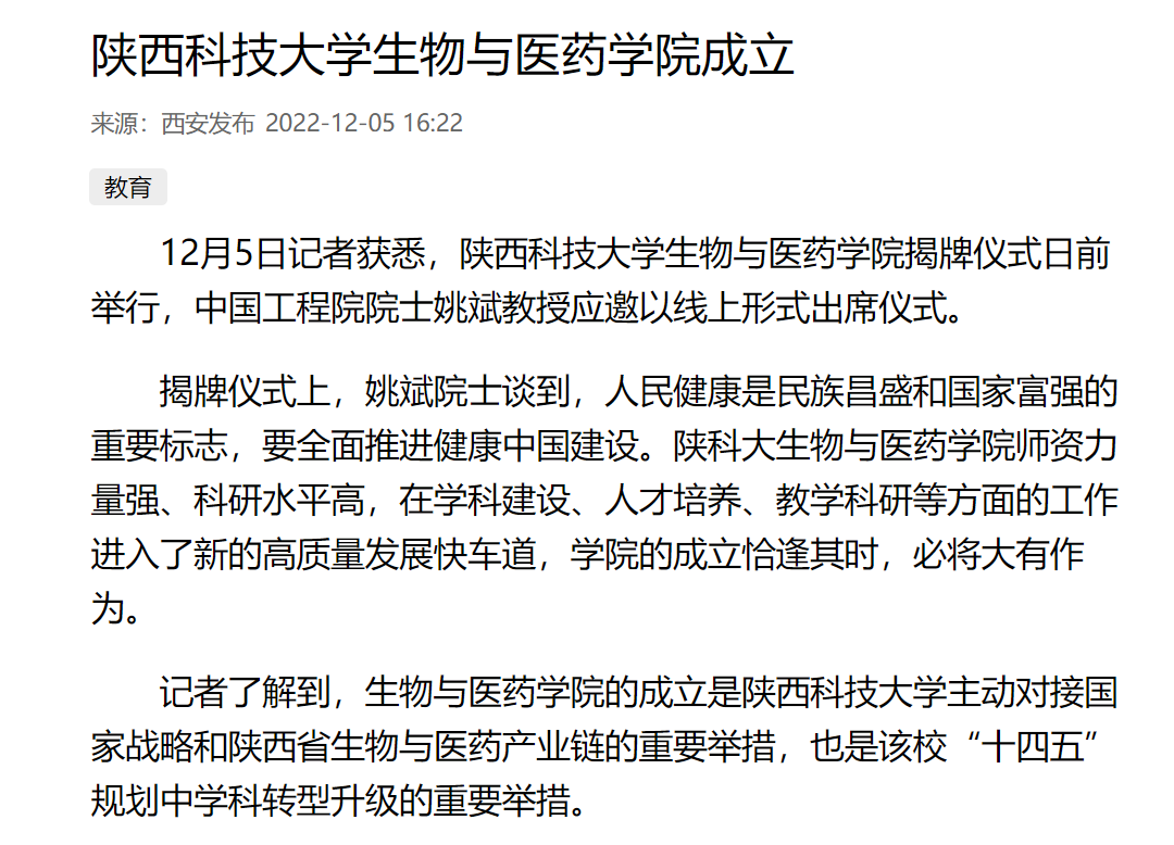 近日,西安發(fā)布報(bào)道我校生物與醫(yī)藥學(xué)院成立。