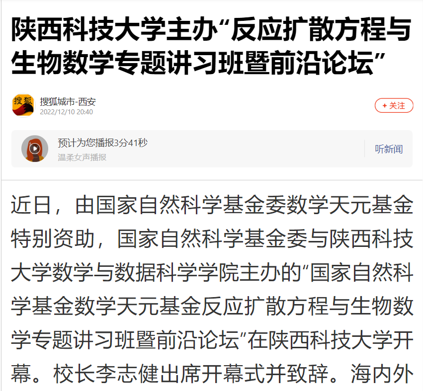 搜狐新聞:陜西科技大學(xué)主辦“反應(yīng)擴(kuò)散方程與生物數(shù)學(xué)專題講習(xí)班暨前沿論壇”