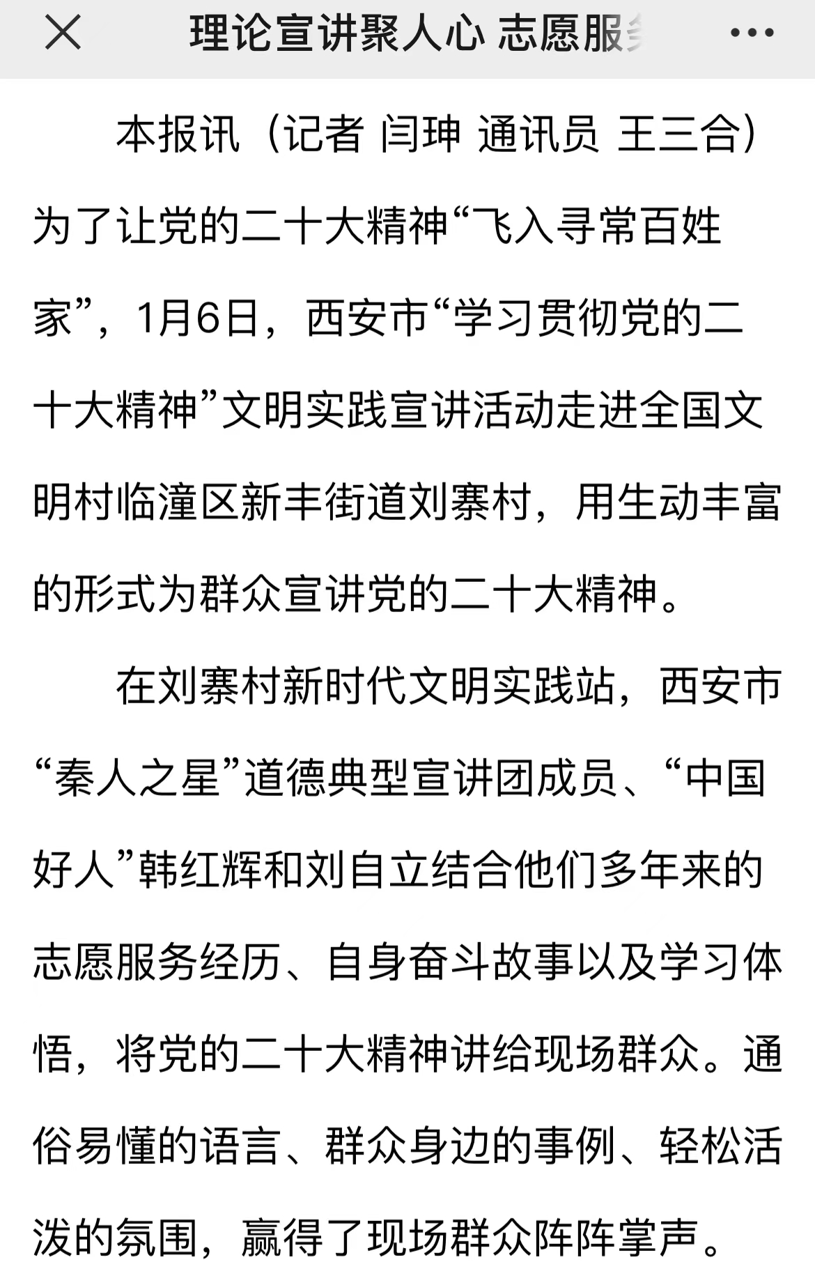 文明西安:“學(xué)習(xí)貫徹黨的二十大精神”文明實踐宣講活動走進(jìn)全國文明村臨潼區(qū)劉寨村