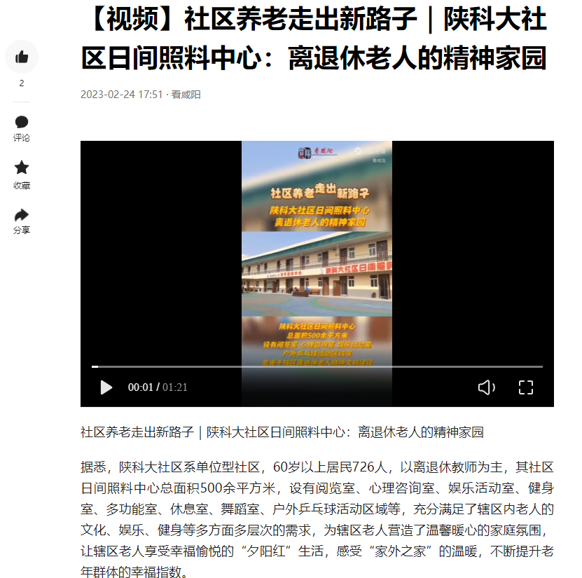 今日頭條:【視頻】社區(qū)養(yǎng)老走出新路子|陜科大社區(qū)日間照料中心:離退休老人的精神家園