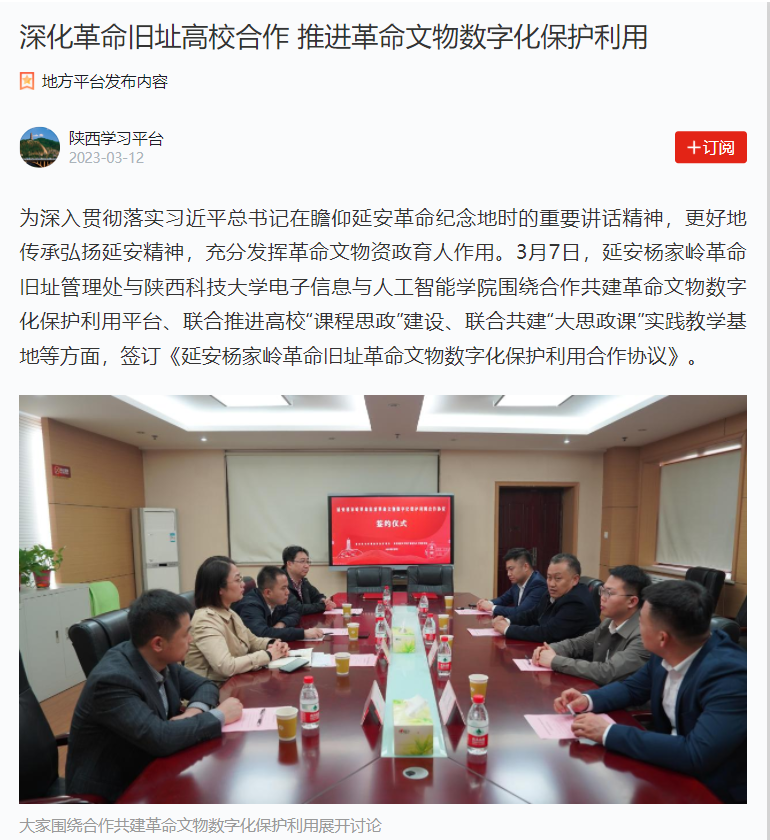 近日,學(xué)習(xí)強(qiáng)國(guó)、秦聞報(bào)道我校攜手楊家?guī)X革命舊址推進(jìn)革命文物數(shù)字化保護(hù)利用。