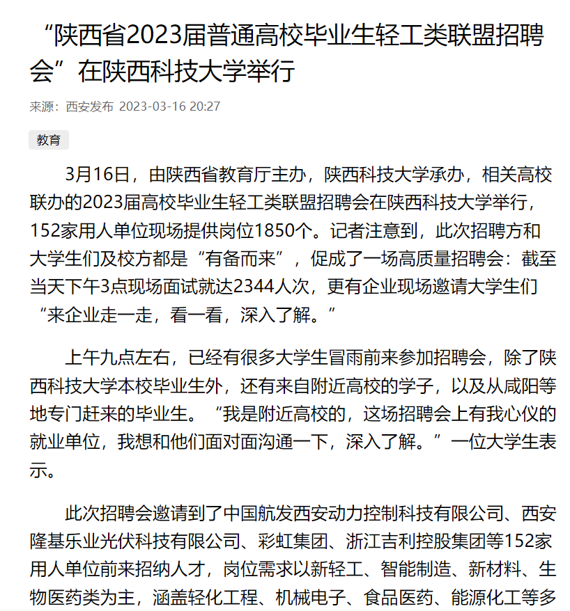 近日,西安發(fā)布報道“陜西省2023屆普通高校畢業(yè)生輕工類聯(lián)盟招聘會”在我校舉行。