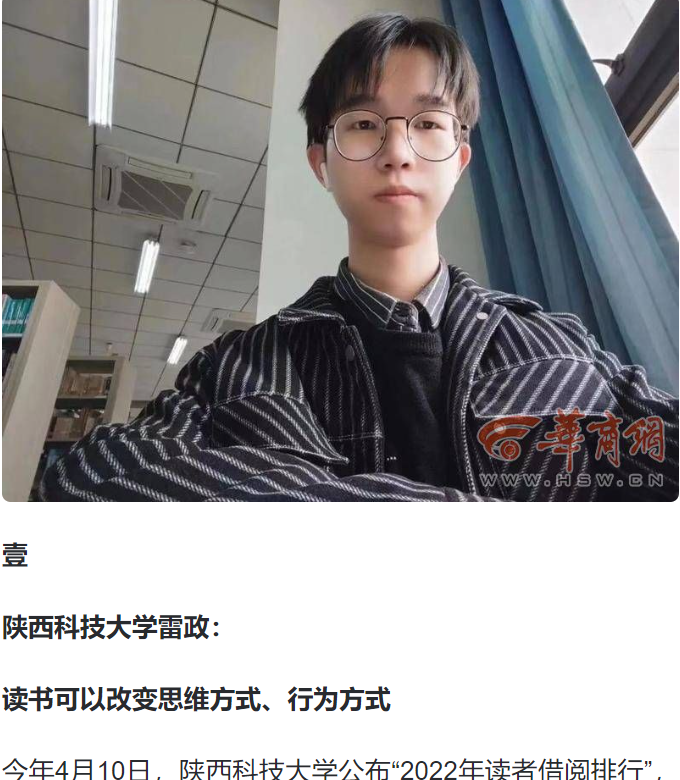 近日,華商頭條、二三里資訊報(bào)道2022年位列我校圖書借閱榜首的雷政同學(xué)的閱讀故事。