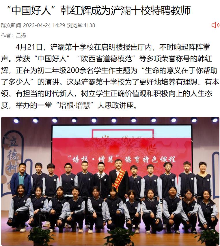 群眾新聞:“中國(guó)好人”韓紅輝成為浐灞十校特聘教師