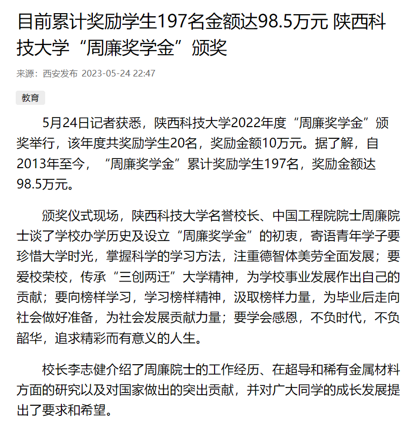 西安發(fā)布:目前累計獎勵學(xué)生197名金額達98.5萬元 陜西科技大學(xué)“周廉獎學(xué)金”頒獎