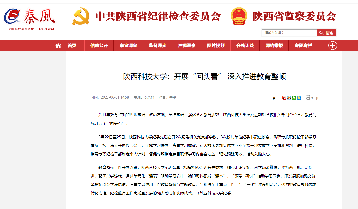 近日,秦風(fēng)網(wǎng)報(bào)道我校紀(jì)檢干部隊(duì)伍教育整頓工作。