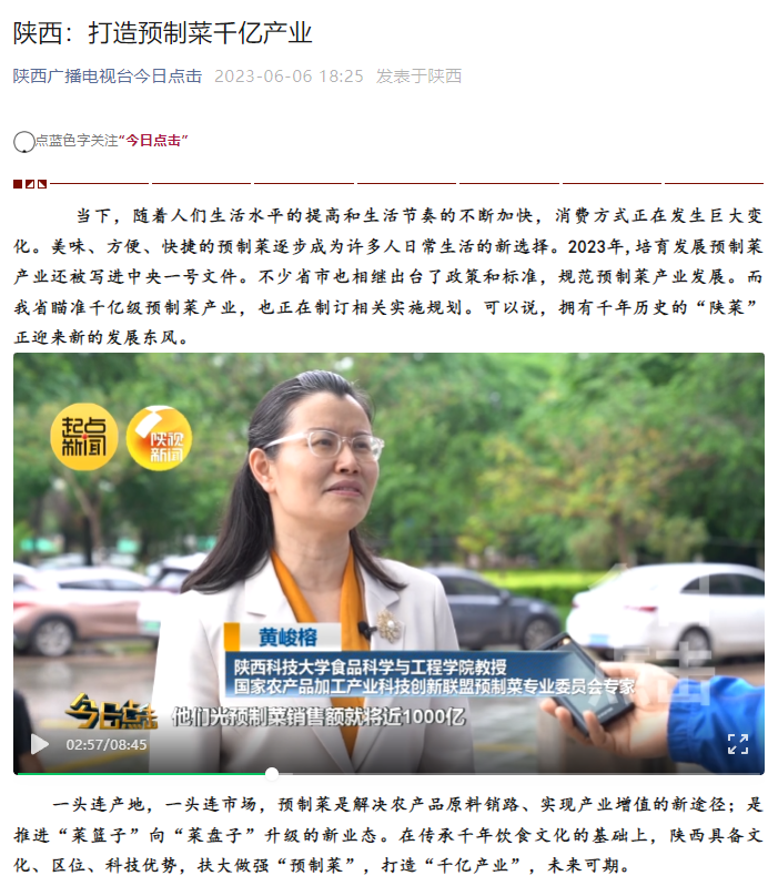 近日,陜西廣播電視臺《今日點擊》欄目報道我校食品科學(xué)與工程學(xué)院(生物與醫(yī)藥學(xué)院)黃峻榕教授解讀陜西打造預(yù)制菜千億產(chǎn)業(yè)規(guī)劃。