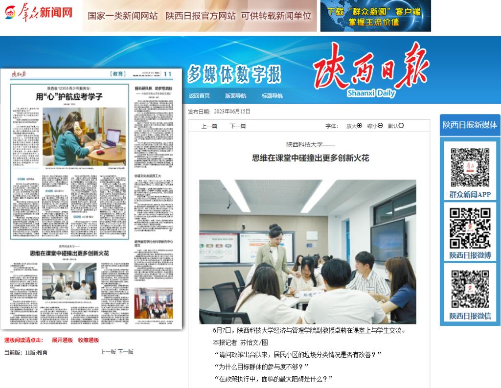 近日,《陜西日報(bào)》報(bào)道我校教學(xué)創(chuàng)新課堂讓思維在課堂中碰撞出更多創(chuàng)新火花。