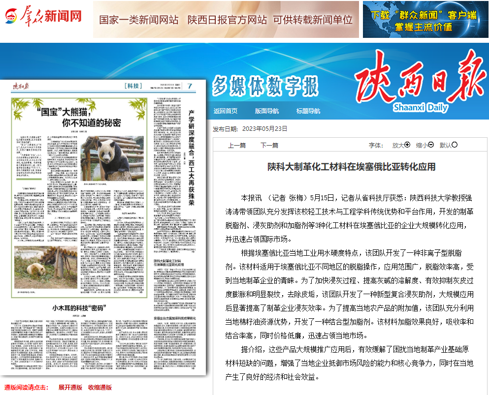 近日,《陜西日報》、陜西省科技廳官網(wǎng)報道我校制革化工材料在埃塞俄比亞轉(zhuǎn)化應(yīng)用。