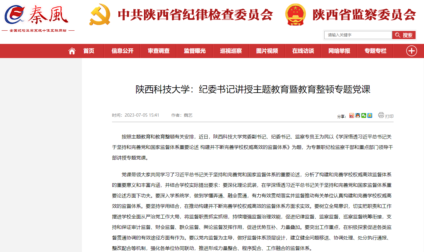 近日,秦風(fēng)網(wǎng)報(bào)道我校黨委副書記、紀(jì)委書記、監(jiān)察專員王為民講授主題教育暨教育整頓專題黨課。
