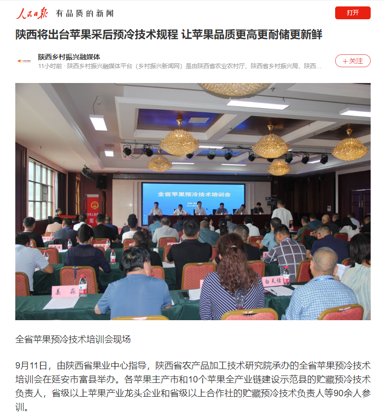 近日,《人民日?qǐng)?bào)》APP、騰訊網(wǎng)、陜西省果業(yè)中心官方微信公眾號(hào)、網(wǎng)易新聞報(bào)道陜西農(nóng)產(chǎn)品加工技術(shù)研究院承辦全省蘋果預(yù)冷技術(shù)培訓(xùn)會(huì)。