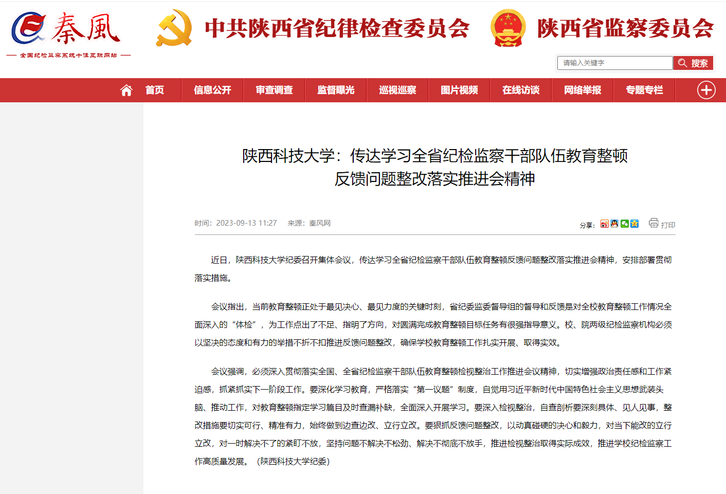 近日,秦風(fēng)網(wǎng)報道我校傳達(dá)學(xué)習(xí)全省紀(jì)檢監(jiān)察干部隊伍教育整頓反饋問題整改落實推進(jìn)會精神。