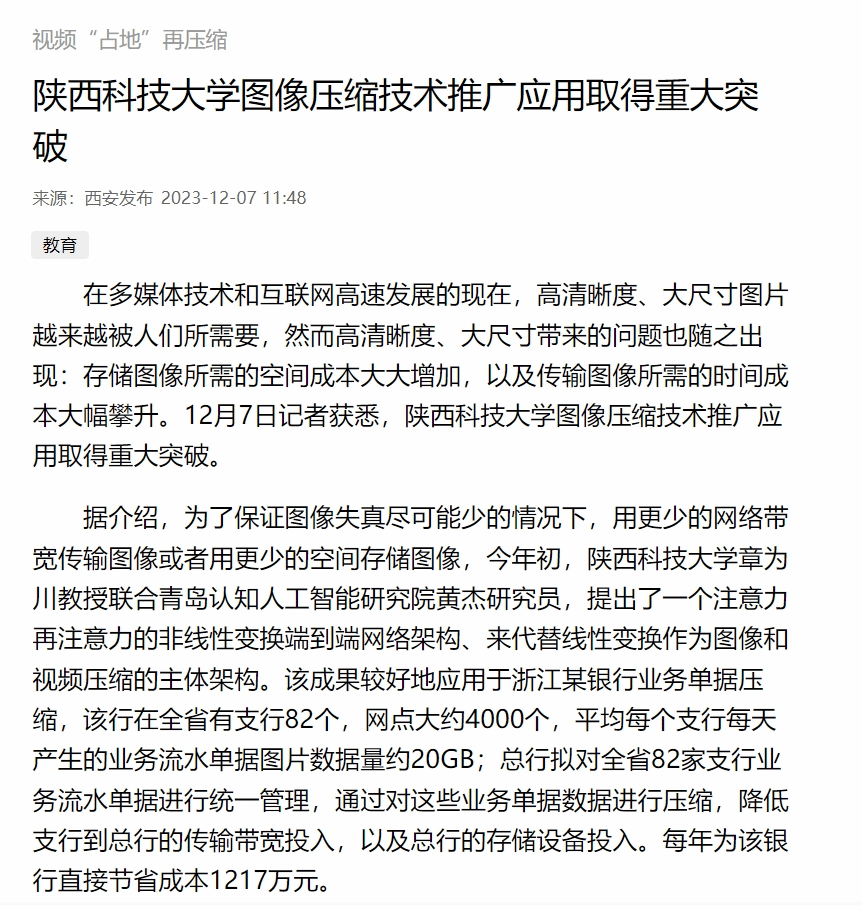 西安發(fā)布:陜西科技大學(xué)圖像壓縮技術(shù)推廣應(yīng)用取得重大突破
