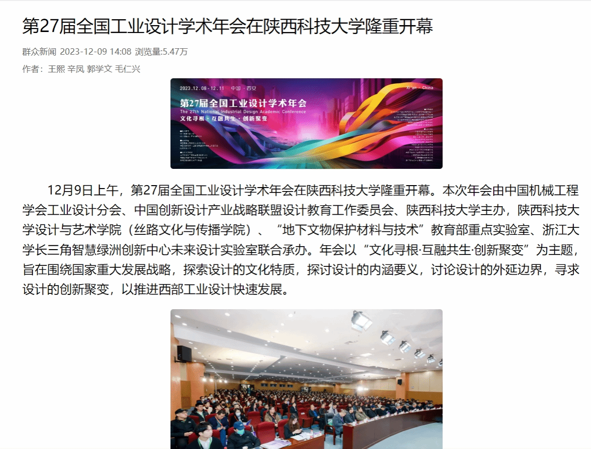 近日,群眾新聞、鳳凰網(wǎng)報道第27屆全國工業(yè)設(shè)計學術(shù)年會在陜西科技大學成功舉辦。