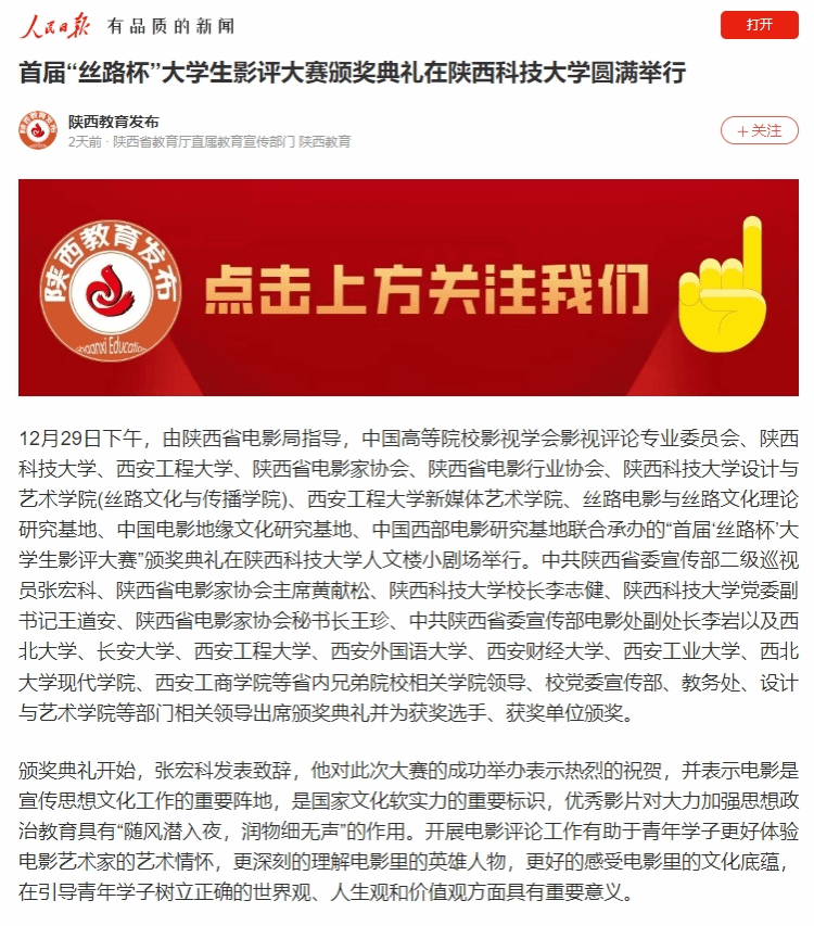 《人民日?qǐng)?bào)》APP:首屆“絲路杯”大學(xué)生影評(píng)大賽頒獎(jiǎng)典禮在陜西科技大學(xué)圓滿舉行