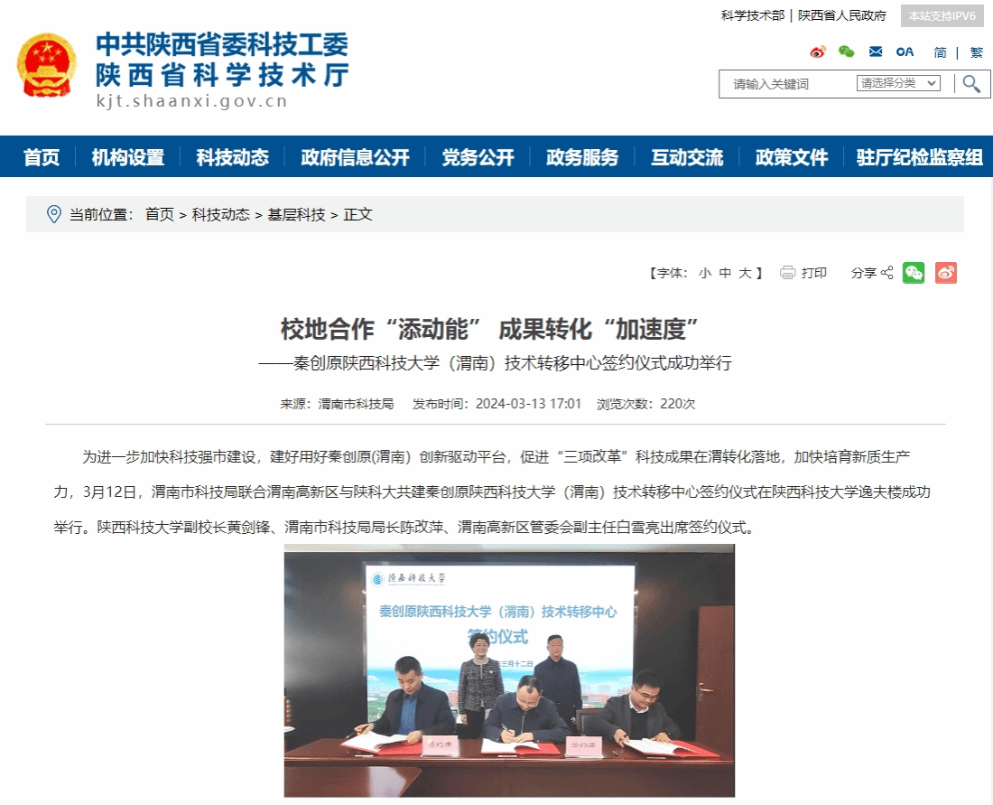 近日,陜西省科技廳官網、今日頭條報道秦創(chuàng)原陜西科技大學(渭南)技術轉移中心簽約儀式成功舉行。