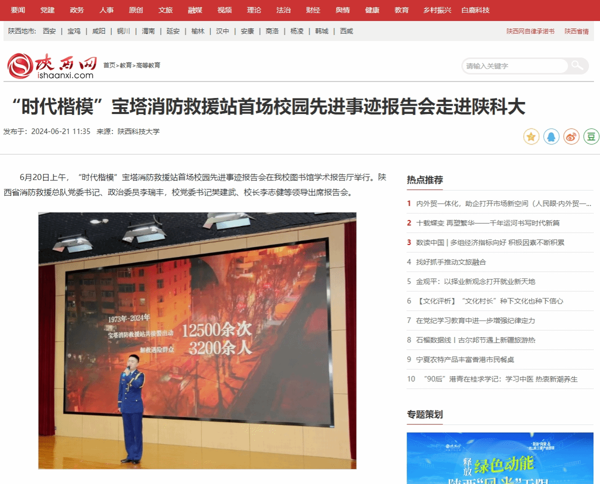 陜西網(wǎng):“時代楷模”寶塔消防救援站首場校園先進事跡報告會走進陜科大
