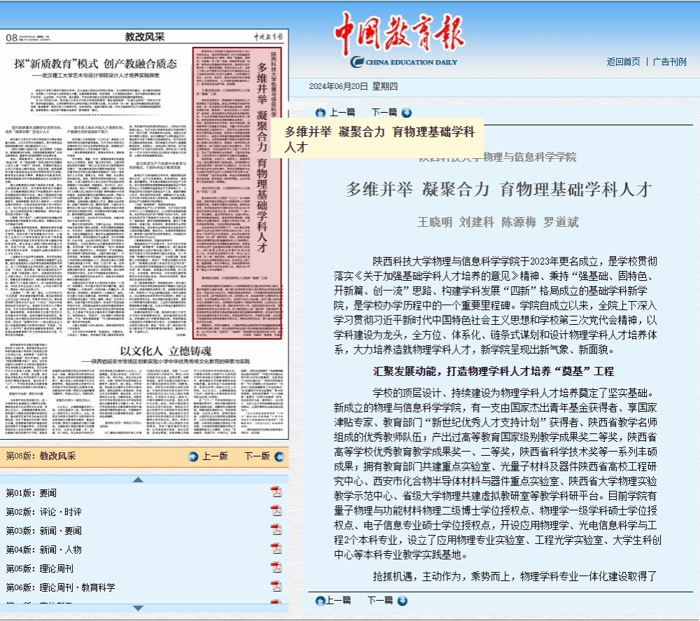 近日,《中國教育報》報道我校物理學院多維并舉、凝聚合力,育物理基礎學科人才。