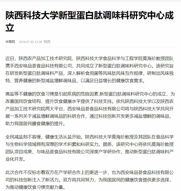 近日,華商網(wǎng)報(bào)道我校新型蛋白肽調(diào)味料研究中心成立。