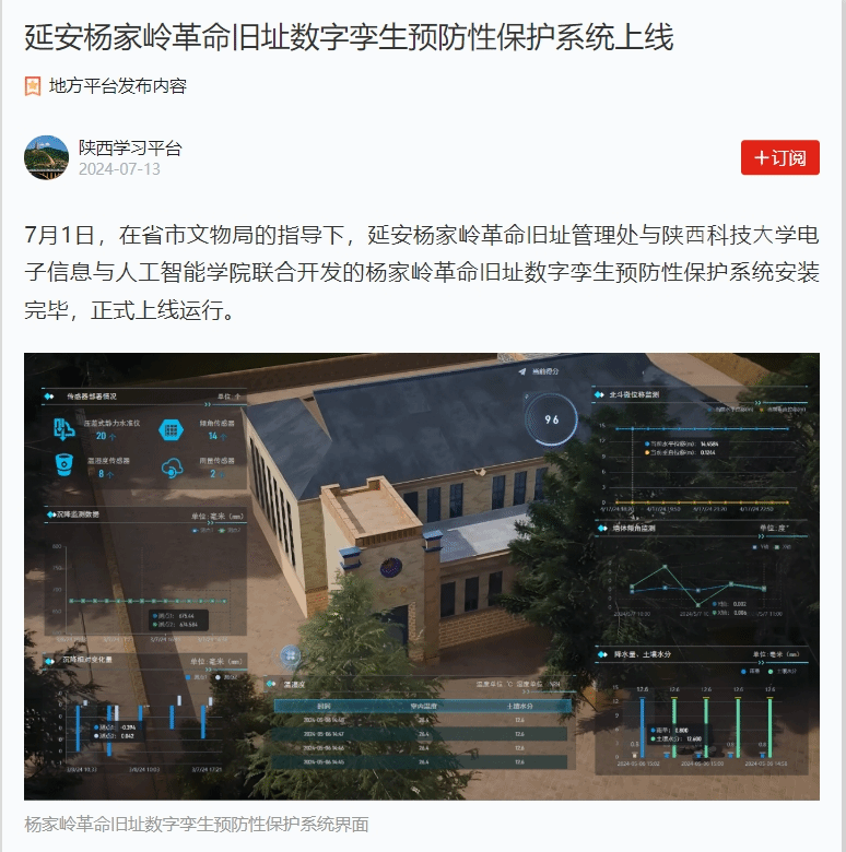 近日,學(xué)習(xí)強國陜西學(xué)習(xí)平臺報道延安楊家?guī)X革命舊址數(shù)字孿生預(yù)防性保護系統(tǒng)上線。