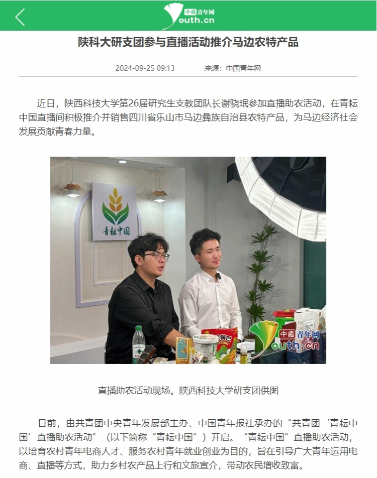 中國(guó)青年網(wǎng):陜科大研支團(tuán)參與直播活動(dòng)推介馬邊農(nóng)特產(chǎn)品