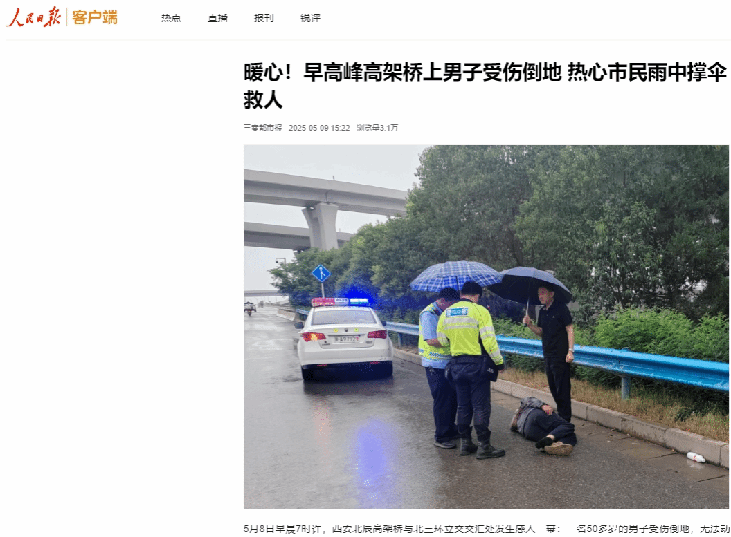 人民日?qǐng)?bào)客戶端:暖心!早高峰高架橋上男子受傷倒地 熱心市民雨中撐傘救人