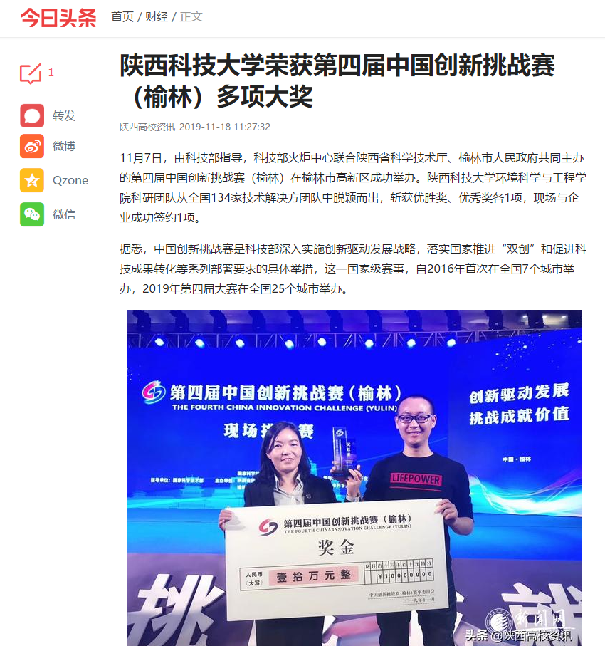 今日頭條:陜西科技大學(xué)榮獲第四屆中國(guó)創(chuàng)新挑戰(zhàn)賽(榆林)多項(xiàng)大獎(jiǎng)