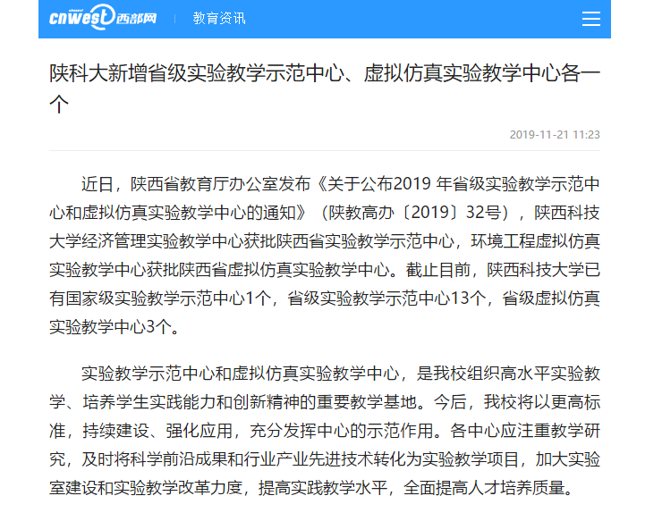西部網(wǎng)報(bào)道:陜科大新增省級(jí)實(shí)驗(yàn)教學(xué)示范中心、虛擬仿真實(shí)驗(yàn)教學(xué)中心各一個(gè)