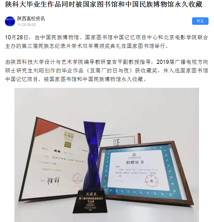 由陜西科技大學設計與藝術學院編導教研室吉平副教授指導,2019屆廣播電視方向碩士研究生劉昭創(chuàng)作的畢業(yè)作品《豆腐廠的日與夜》獲收藏獎,并入選國家圖書館中國記憶項目,被國家圖書館和中國民族博物館永久收藏。