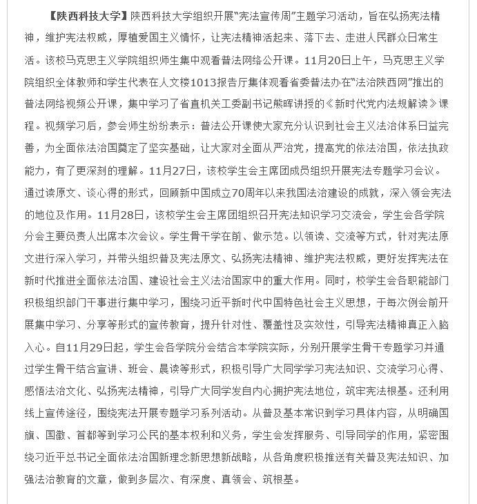 【陜西科技大學(xué)】陜西科技大學(xué)組織開展“憲法宣傳周”主題學(xué)習(xí)活動,旨在弘揚憲法精神,維護憲法權(quán)威,厚植愛國主義情懷,讓憲法精神活起來、落下去、走進人民群眾日常生活。該校馬克思主義學(xué)院組織師生集中觀看普法網(wǎng)絡(luò)公開課。11月20日上午,馬克思主義學(xué)院組織全體教師和學(xué)生代表在人文樓1013報告廳集體觀看省委普法辦在“法治陜西網(wǎng)”推出的普法網(wǎng)絡(luò)視頻公開課,集中學(xué)習(xí)了省直機關(guān)工委副書記熊暉講授的《新時代黨內(nèi)法規(guī)解讀》課程。視頻學(xué)習(xí)后,參會師生紛紛表示:普法公開課使大家充分認(rèn)識到社會主義法治體系日益完善,為全面依法治國奠定了堅實基礎(chǔ),讓大家對全面從嚴(yán)治黨,提高黨的依法治國,依法執(zhí)政能力,有了更深刻的理解。11月27日,該校學(xué)生會主席團成員組織開展憲法專題學(xué)習(xí)會議。通過讀原文、談心得的形式,回顧新中國成立70周年以來我國法治建設(shè)的成就,深入領(lǐng)會憲法的地位及作用。11月28日,該校學(xué)生會主席團組織召開憲法知識學(xué)習(xí)交流會,學(xué)生會各學(xué)院分會主要負(fù)責(zé)人出席本次會議。學(xué)生骨干學(xué)在前、做示范。以領(lǐng)讀、交流等方式,針對憲法原文進行深入學(xué)習(xí),并帶頭組織普及憲法原文、弘揚憲法精神、維護憲法權(quán)威,更好發(fā)揮憲法在新時代推進全面依法治國、建設(shè)社會主義法治國家中的重大作用。同時,校學(xué)生會各職能部門積極組織部門干事進行集中學(xué)習(xí),圍繞習(xí)近平新時代中國特色社會主義思想,于每次例會前開展集中學(xué)習(xí)、分享等形式的宣傳教育,提升針對性、覆蓋性及實效性,引導(dǎo)憲法精神真正入腦入心。自11月29日起,學(xué)生會各學(xué)院分會結(jié)合本學(xué)院實際,分別開展學(xué)生骨干專題學(xué)習(xí)并通過學(xué)生骨干結(jié)合宣講、班會、晨讀等形式,積極引導(dǎo)廣大同學(xué)學(xué)習(xí)憲法知識、交流學(xué)習(xí)心得、感悟法治文化、弘揚憲法精神,引導(dǎo)廣大同學(xué)發(fā)自內(nèi)心擁護憲法地位,筑牢憲法根基。還利用線上宣傳途徑,圍繞憲法開展專題學(xué)習(xí)系列活動。從普及基本常識到學(xué)習(xí)具體內(nèi)容,從明確國旗、國徽、首都等到學(xué)習(xí)公民的基本權(quán)利和義務(wù),學(xué)生會發(fā)揮服務(wù)、引導(dǎo)同學(xué)的作用,緊密圍繞習(xí)近平總書記全面依法治國新理念新思想新戰(zhàn)略,從各角度積極推送有關(guān)普及憲法知識、加強法治教育的文章,做到多層次、有深度、真領(lǐng)會、筑根基。