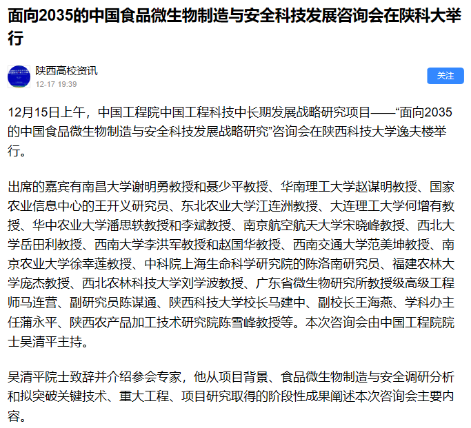 今日頭條:面向2035的中國(guó)食品微生物制造與安全科技發(fā)展咨詢會(huì)在陜科大舉行