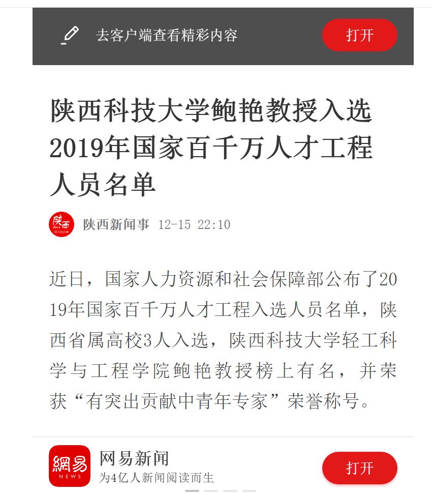 網(wǎng)易新聞:陜西科技大學(xué)鮑艷教授入選2019年國家百千萬人才工程人員名單