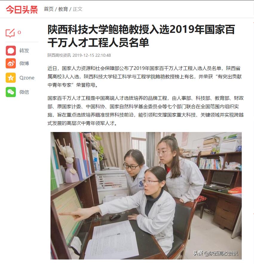 今日頭條:陜西科技大學(xué)鮑艷教授入選2019年國家百千萬人才工程人員名單