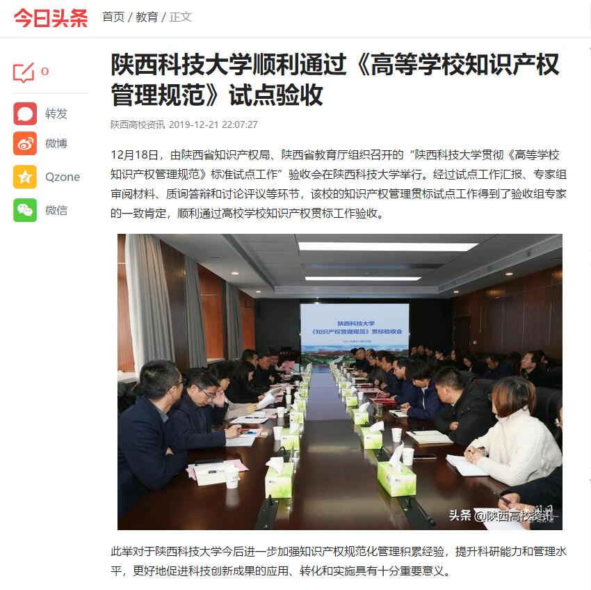 今日頭條:陜西科技大學(xué)順利通過《高等學(xué)校知識產(chǎn)權(quán)管理規(guī)范》試點驗收