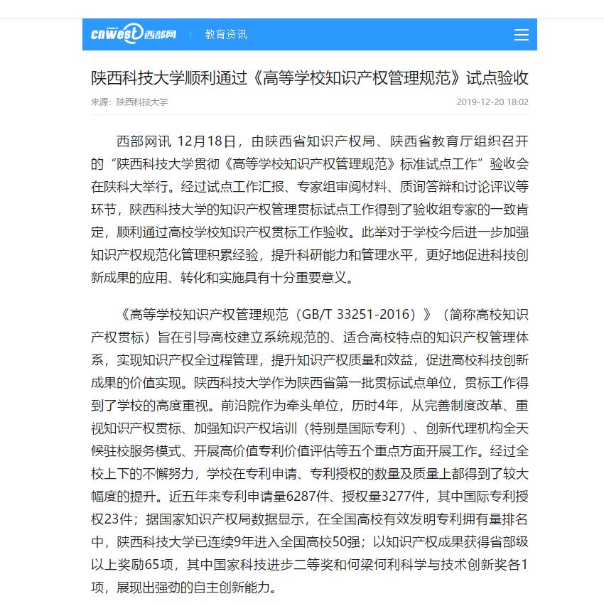 西部網(wǎng):陜西科技大學(xué)順利通過《高等學(xué)校知識產(chǎn)權(quán)管理規(guī)范》試點驗收