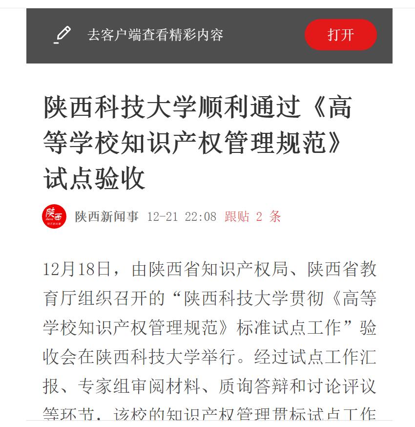 網(wǎng)易新聞APP:陜西科技大學(xué)順利通過《高等學(xué)校知識產(chǎn)權(quán)管理規(guī)范》試點驗收