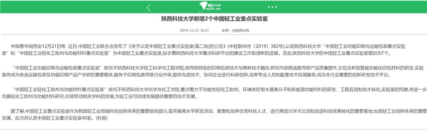 中國青年網(wǎng):陜西科技大學(xué)新增2個中國輕工業(yè)重點實驗室