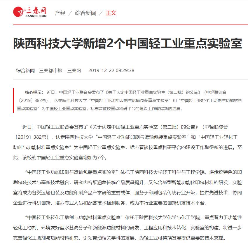 三秦網(wǎng):陜西科技大學(xué)新增2個中國輕工業(yè)重點實驗室