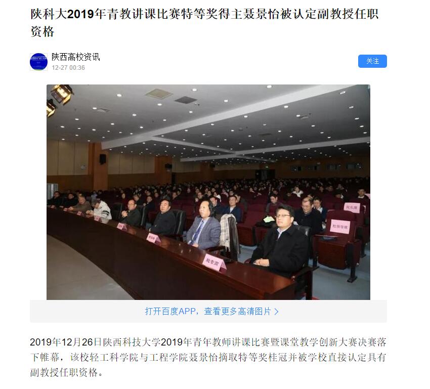 百度APP:陜科大2019年青教講課比賽特等獎得主聶景怡被認(rèn)定副教授任職資格