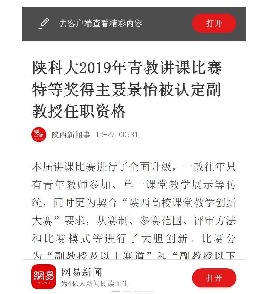 網(wǎng)易新聞APP:陜科大2019年青教講課比賽特等獎得主聶景怡被認(rèn)定副教授任職資格