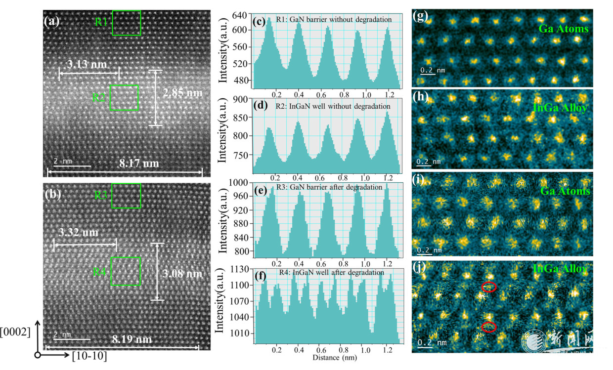 馬淑芳教授利用變溫微區(qū)光致發(fā)光譜儀(PL)和球差校正電子顯微鏡(ACTEM)分析了GaN基綠光LED老化后發(fā)光性能和有源區(qū)微觀結(jié)構(gòu)的變化。PL結(jié)果表明,老化后GaN基LED的發(fā)光強度下降36.8%且峰值波長藍移1.6nm;STEM觀察進一步發(fā)現(xiàn)了老化后InGaN量子阱中出現(xiàn)In間隙原子,InGaN量子阱的馳豫度達80%。結(jié)合HRXRD結(jié)果以及DFT計算,老化后GaN基綠光LED發(fā)光性能下降是由于點缺陷密度的增加、量子限制效應(yīng)減弱以及量子限制斯塔克效應(yīng)增強導(dǎo)致。本項工作利用ACTEM直接觀察到In間隙原子,揭示了點缺陷對GaN基綠光LED發(fā)光性能的影響機制。相關(guān)成果發(fā)表在國際知名期刊Appl. Phys. Lett.(IF= 3.597)(https://doi.org/10.1063/5.0021659)上。