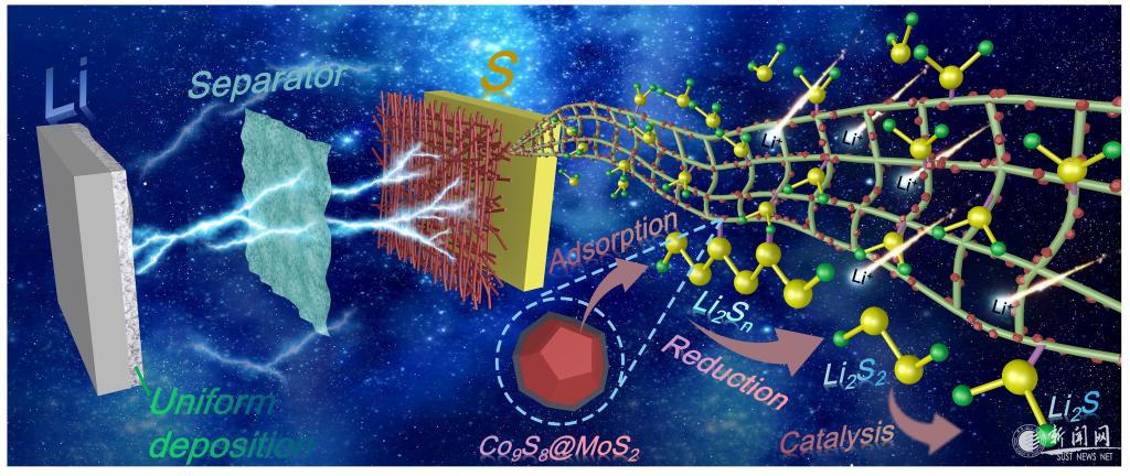 Co9S8@MoS2/CNF用作鋰硫電池功能層的示意圖