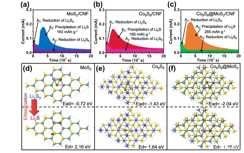 Li2S的成核實驗結(jié)果及Li2S2在不同功能層結(jié)合能和解吸能的DFT計算結(jié)果